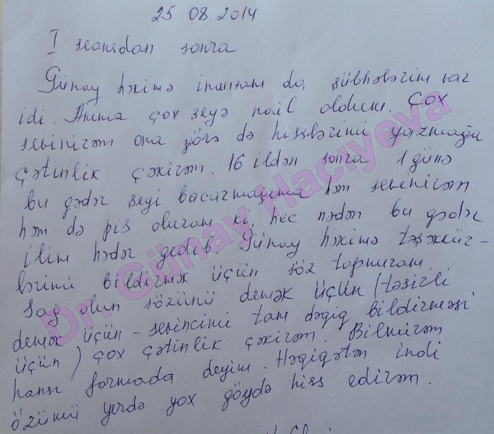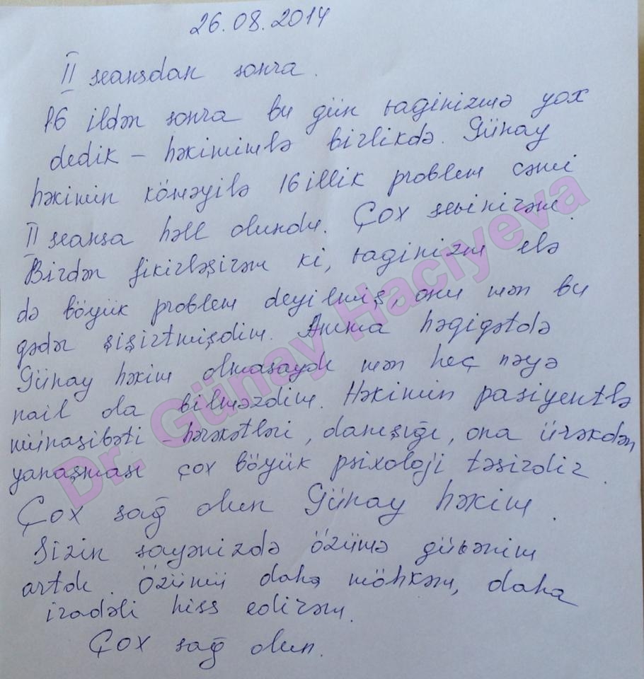 Mingəçevirdən müraciət edən illik vaginizm pasientimizlə 2 seans ( 2 gün ) işlədik. Müalicə müddətində pasientimizin yazdığı duyğuları paylaşmaq istəyirəm: